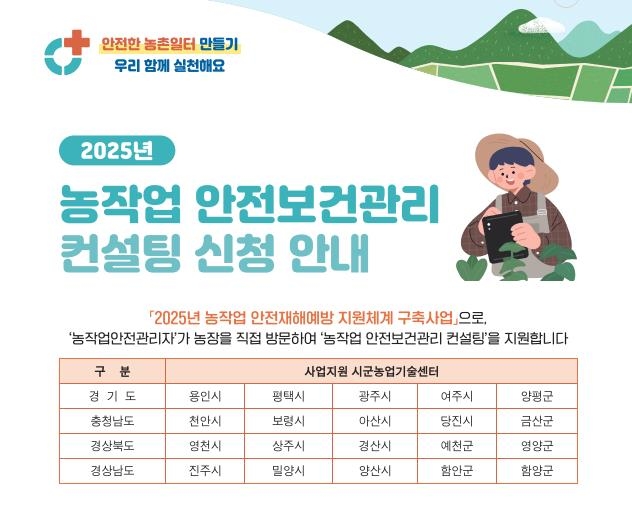 상담은 올해 4월부터 경기, 충남, 경북, 경남 등 4개 도에서 시범적으로 시행됩니다. 이 지역의 20개 시·군에서 농업기술원과 협력하여 진행될 예정입니다. 이를 통해 농업인들은 보다 안전한 작업 환경을 조성할 수 있을 것입니다.