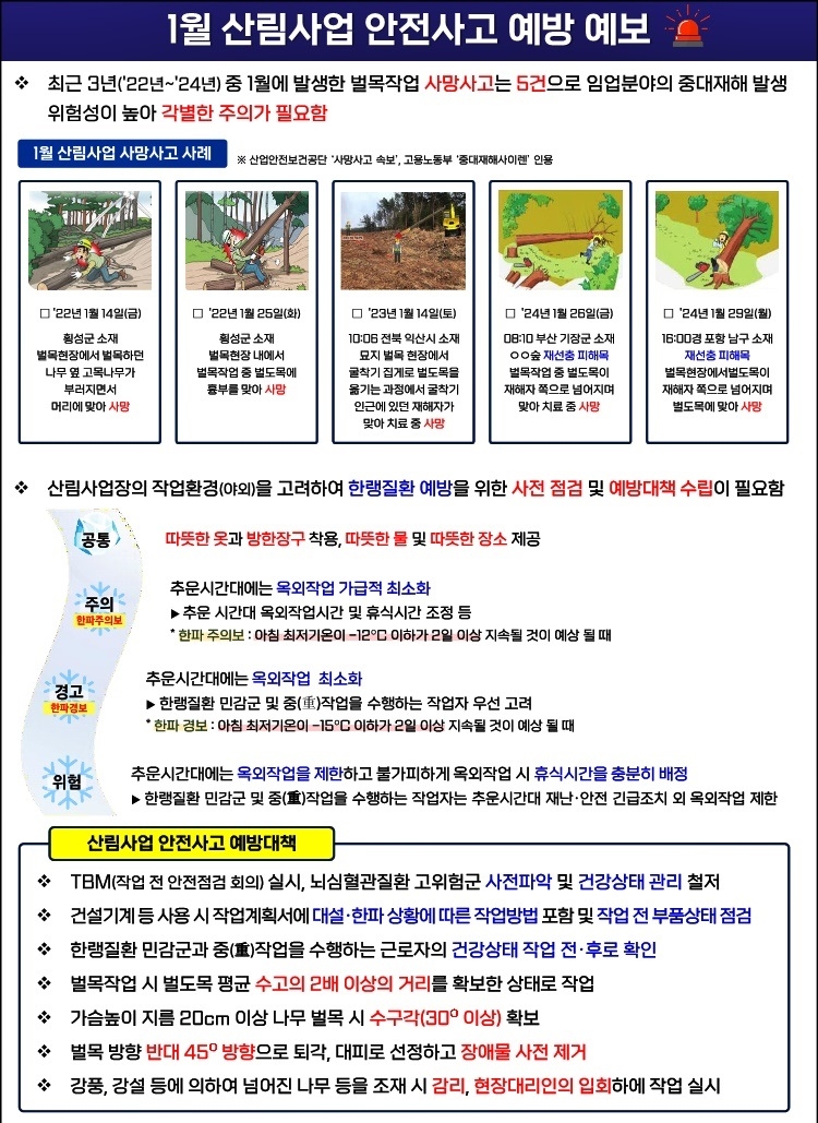 산림청은 최근 '산림사업 안전사고 예방예보제'를 도입하여 산림사업장 내 재해와 위험 상황을 예방하고, 현장 근무자의 안전의식을 높이기 위한 노력을 기울이고 있습니다. 이 제도는 매월 제공되는 안전사고 예방예보를 통해 근로자들에게 필요한 정보를 제공하고, 안전한 작업 환경을 조성하는 데 기여하고자 합니다.